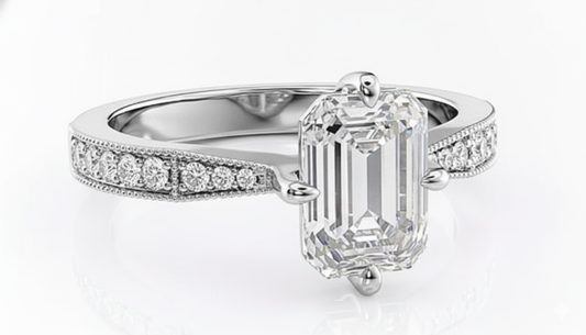 Emerald Cut Moissanite Engagement Ring, Stone Set Shoulders With Milgrain Edge