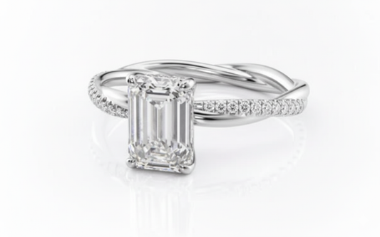 Emerald Cut Moissanite Engagement Ring, Twisted Shoulder Set With Hidden Halo