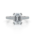 The Emerald Cut Moissanite Engagement Ring, Hidden Halo features a 2.00ct center stone with 0.30ct side stones, offering an elegant and timeless design.