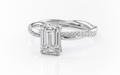 The Emerald Cut Moissanite Engagement Ring, Twisted Shoulder Set With Hidden Halo features a 2.00ct center stone with 0.25ct side stones, offering an elegant, sophisticated design.
