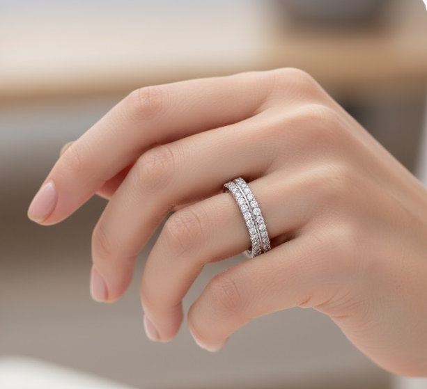 The Round Cut Full Eternity Moissanite Wedding Ring by Franc Laurent features two continuous rows of round-cut moissanite stones, set in sterling silver. This elegant ring symbolizes enduring love with its timeless design and brilliant sparkle.